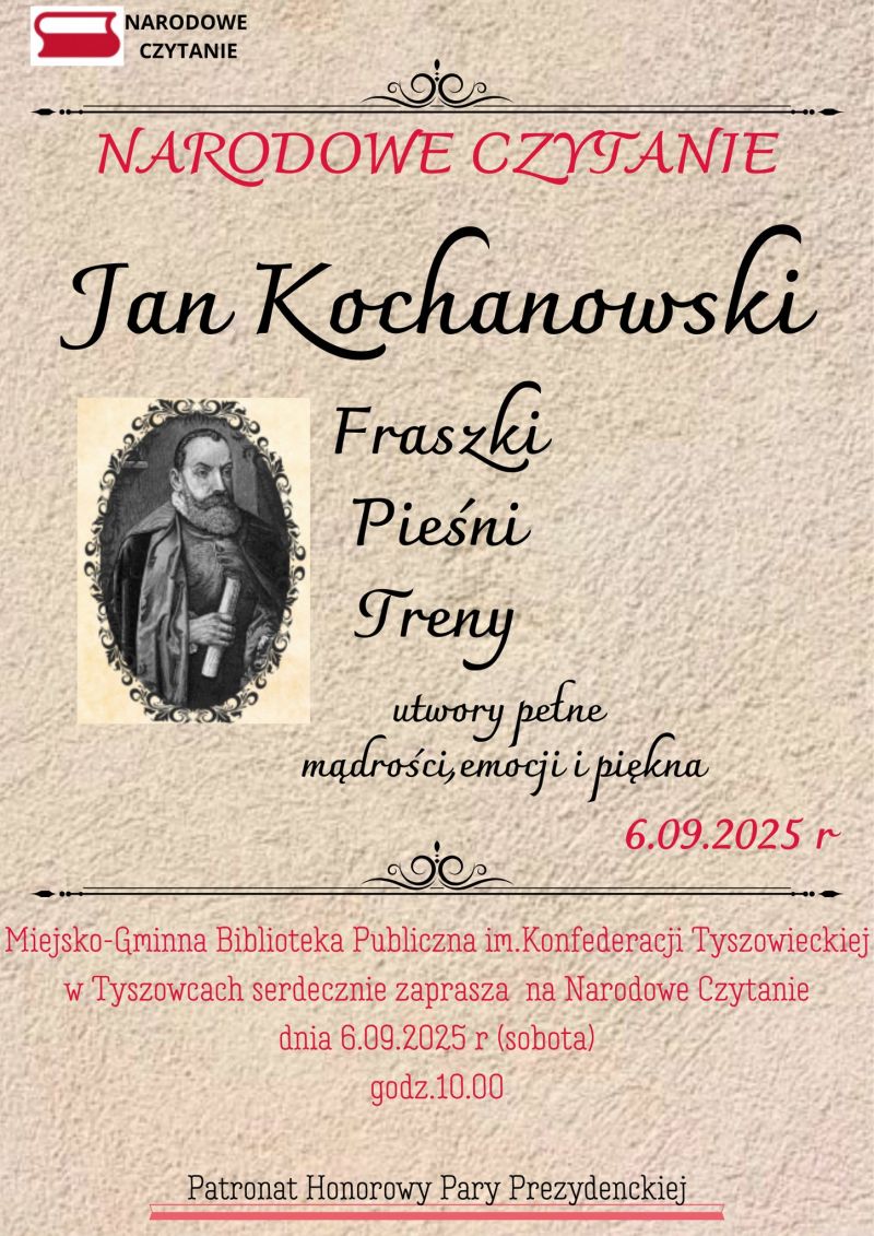 Miłośnicy rodzimej literatury w Tyszowcach i okolicy kolejny raz wspólnie zasiądą do lektury. Tym razem w ramach "Narodowego czytania" sięgną do tekstów Jana Kochanowskiego. Fraszki, pieśni i treny będzie można czytać albo ich posłuchać w sobotę 6 września o 10.00 w Miejsko-Gminnej Bibliotece Publicznej w Tyszowcach.