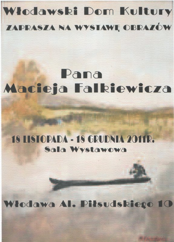 Włodawski Dom Kultury zaprasza na otwarcie wystawy malarstwa Macieja Falkiewicza. Wernisaż odbędzie się w piątek 18 listopada o 17.00 w galerii na piętrze WDK.