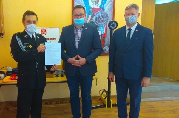 W imieniu samorządu sprzęt oficjalnie przekazali - wójt gminy Wojciechów Artur Markowski i przewodniczący rady gminy Michał Sumiński, a odebrał prezes OSP Wojciechów Stanisław Kamela.