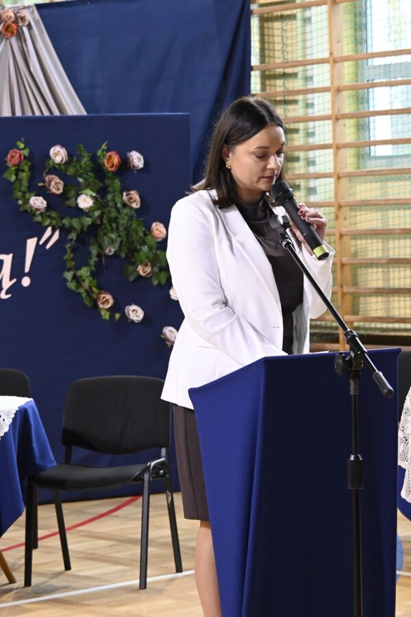 Główna część szkolnej uroczystości rozpoczęła się odczytaniem uchwały Rady Miejskiej w Zwierzyńcu o nadaniu szkole imienia i sztandaru. Dokument, przyjęty przez radnych w wakacje, przypomniała burmistrz Edyta Wolanin, która oficjalnie przekazała dyrektor placówki Grażynie Kawce nowy sztandar. Jego projekt opracowała Elżbieta Hałasa, która na biało-czerwonym awersie z białym orłem w koronie umieściła słowa - "Bądź umiłowanej Ojczyzny podporą". Wypowiedział je Jan Zamoyski podczas otwarcia Akademii Zamojskiej w 1595 roku. Na rewersie sztandaru znajduje się wizerunek patronki szkoły - Róży Zamoyskiej, jako kobiety szlachetnej i odważnej, która podczas II wojny światowej niosła pomoc dzieciom wysiedlonym z Zamojszczyzny. W dolnej części widnieje symboliczny motyw trojga dzieci trzymających się za ręce, będący znakiem wspólnoty, troski i pamięci o najmłodszych ofiarach wojny. Z kolei w górnym rogu znajduje się róża, otoczona zielonymi liśćmi. Róża, jako znak piękna, miłości, dobra i siły, nie ma kolców, co podkreśla oddanie i poświęcenie Róży Zamoyskiej oraz wiarę w przyszłość bez bólu i cierpienia z powodu wojny.