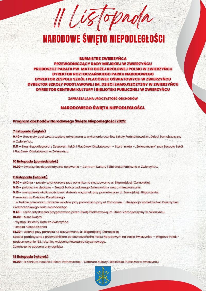 Polonez na deptaku, uroczystość patriotyczno-religijna, spacer i "Bieg niepodległości" oraz konkurs patriotycznych piosenek i pieśni. Tak w skrócie wygląda program obchodów 107. rocznicy odzyskania przez Polskę niepodległości w Zwierzyńcu. Pierwsze wydarzenia są planowane na najbliższy piątek, a ostatnie odbędą się tydzień po narodowym święcie.